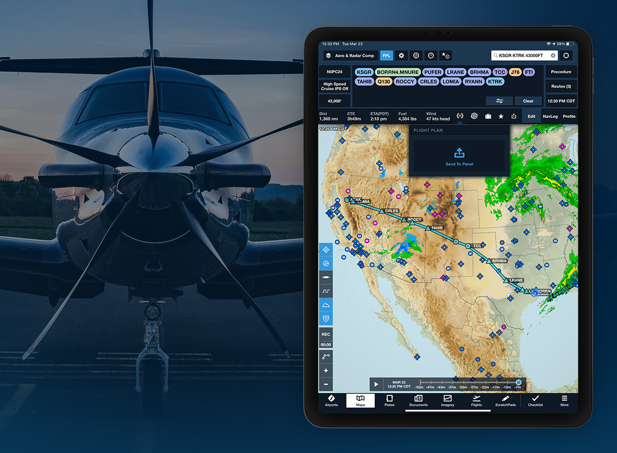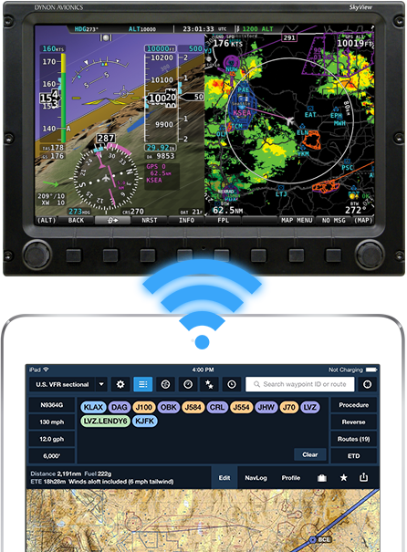 Wi-Fi connectivity between ForeFlight and the SkyView panel-mounted avionics system allows you to flight plan on the go and then sync up with your panel once in the cockpit.