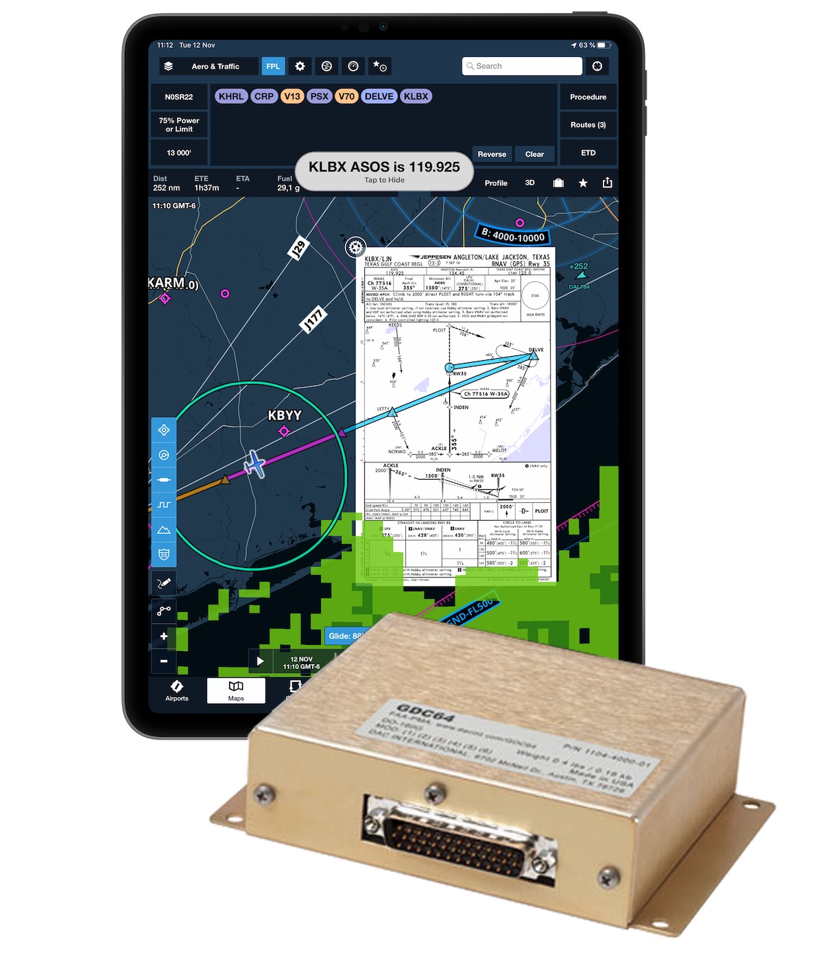 ForeFlight supports connectivity with the GDC64 Tablet Aircraft Interface Unit from DAC International, providing a wired option to supply ForeFlight with GPS and ADS-B data, as well as a constant power supply. The GDC64 serves as an installed adapter between an iPad or iPhone and FreeFlight’s RANGR series of avionics, which supplies the GPS and ADS-B data used by ForeFlight.