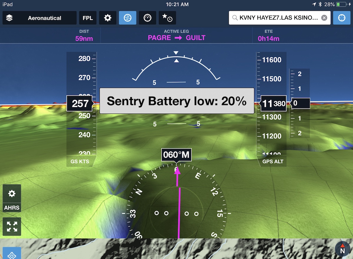ForeFlight warns you when a connected device like Sentry or Stratus reaches 20% battery, allowing you to take appropriate action with time to spare before it shuts down. The alert is currently provided for Sentry, Stratus, all supported Garmin portables, and SiriusXM’s SXAR1.