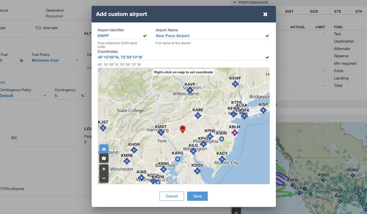 Flexibly plan flights to and from any location you want by defining your own custom airports. Custom airports are defined by a unique four-letter identifier, a name, and a set of lat/long coordinates. All planners on your account can select custom airports as the departure or destination on any flight.