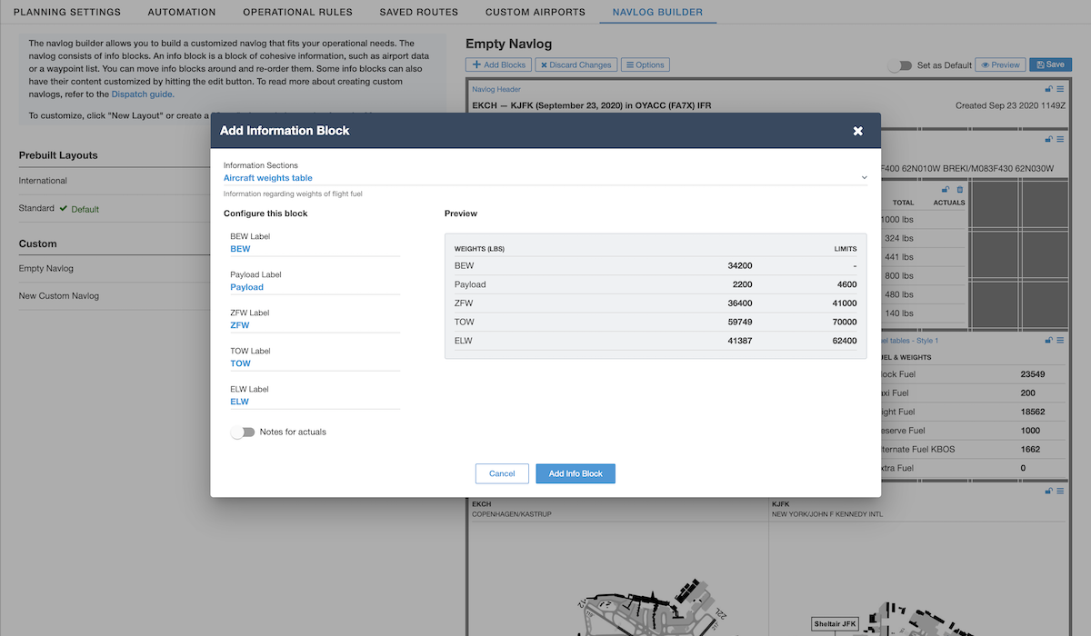 Build a custom Navlog template to fit your operational needs. The Custom Navlog Builder contains widgets that you can edit and move around. Customize the Navlog even further by changing label names, toggling sections on and off, and adding space for notes. Set your new Navlog as the default to enforce its use on all future flights.