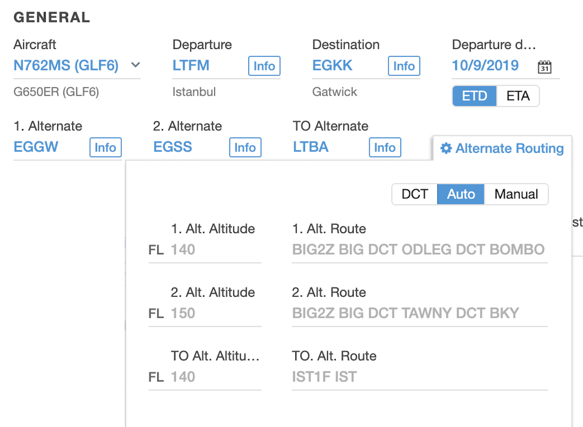 Comply with flight plan requirements in Europe and elsewhere thanks to Dispatch's "route-to-alternate" capability. Use the default DCT option to draw a direct route from planned to alternate airports, use the Auto option to let ForeFlight choose the shortest route using actual waypoints, or enter custom alternate routing using the Manual option.