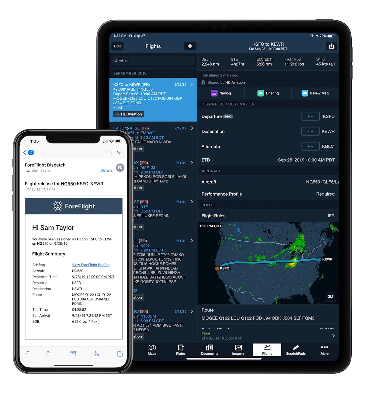Released flights appear in ForeFlight Mobile complete with performance calculations, fuel and weight information, a pre-generated Briefing and Navlog, and other documents, allowing crews to review and brief their flights right away.