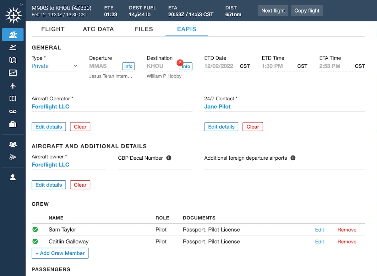 Easily comply with customs procedures by compiling and delivering crew and passenger information via Dispatch. Passports and other sensitive information are securely stored in ForeFlight’s compliant data system, allowing Dispatch to auto-fill documents for easy submission to customs and releasing to crew members directly in ForeFlight Mobile.