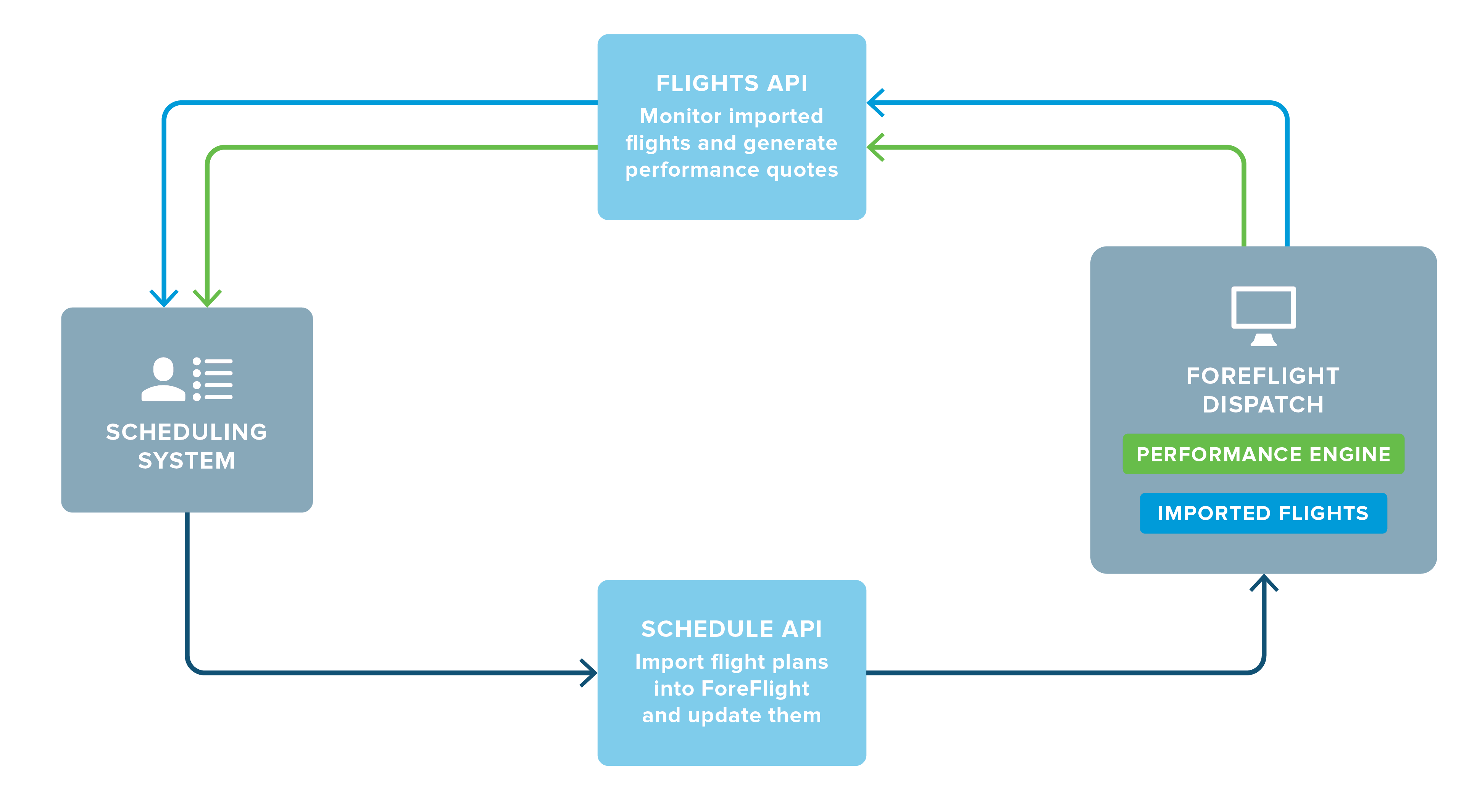 Send performance results and flight documents from Dispatch back into your scheduling system to monitor flights.
