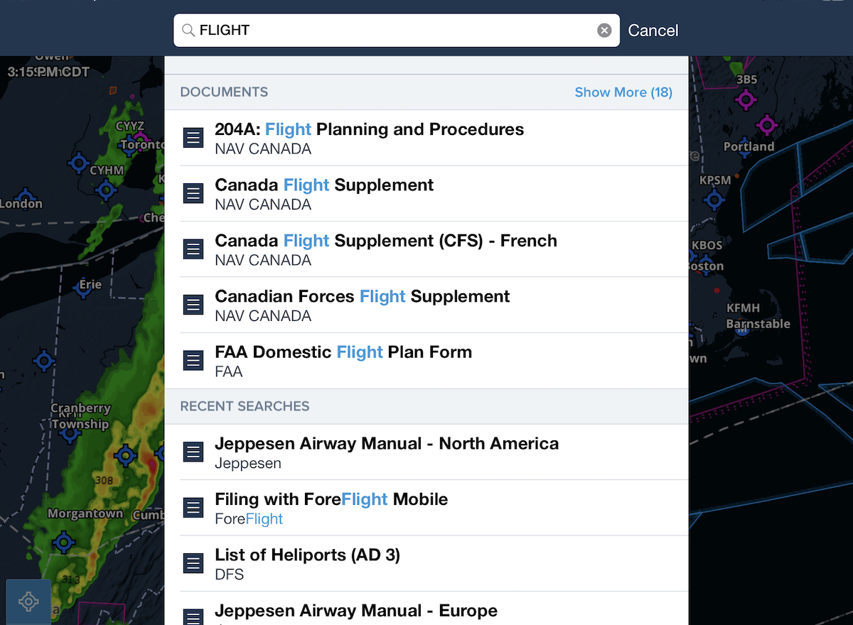 Finding the document you need is easier than ever with ForeFlight’s unified App Search capability. Search for both downloaded and undownloaded documents by name from the Airports, Maps, Plates, or Documents views, see all matching results with your search term highlighted, and download or view documents directly from the search list. The Recent Searches list also includes document searches so you can quickly revisit them.