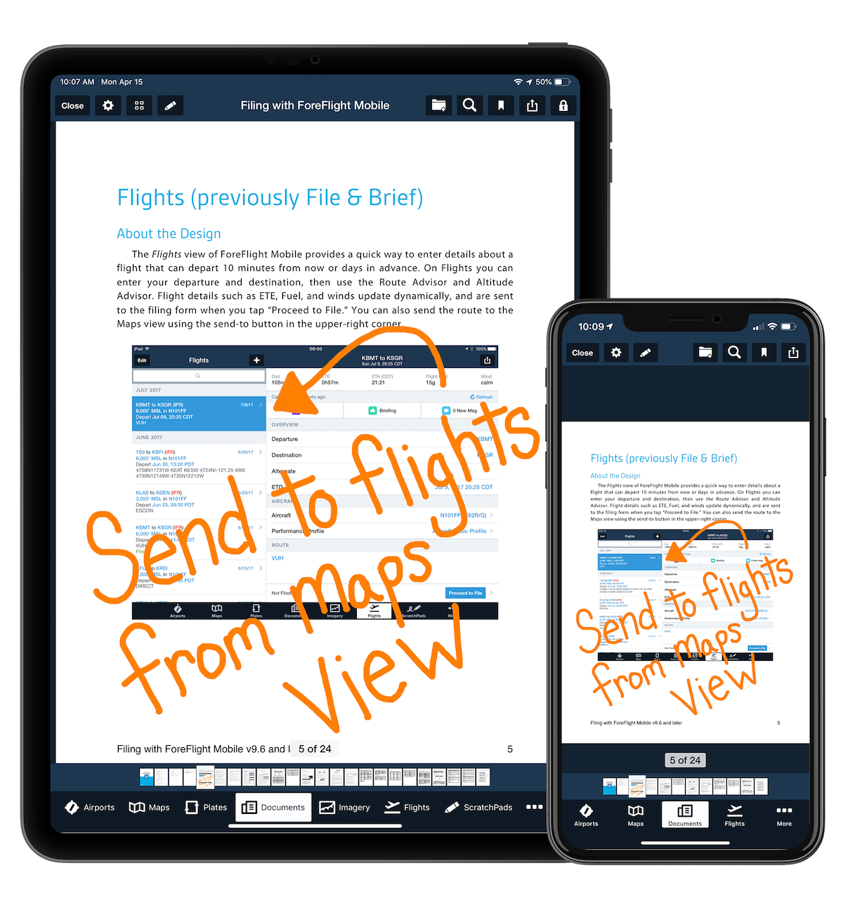 Download, import, view, and annotate documents with ForeFlight’s easy-to-use Documents view. Documents are synced across all your devices and backed up to the ForeFlight Cloud so they’re ready when you need them.
