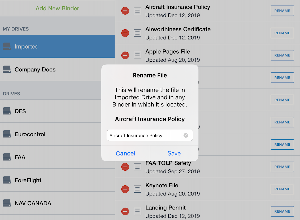 Rename imported documents directly in ForeFlight for enhanced flexibility and organization. Renaming a document in your Imported Drive will also change the name of that document in any Binder you’ve added it to, and vice versa. Rename documents by tapping Edit in the Documents view toolbar while viewing the Imported drive or a binder containing imported documents, then tap Rename next to any document to edit and save its name.