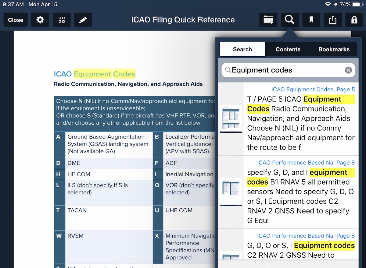 ForeFlight’s document viewer provides flexible options for viewing, customizing and searching documents. Navigate within documents by using grid view, swiping left or right, or by using the slider at the bottom of the page. ForeFlight syncs your custom annotations and bookmarks across all your devices so they’re available whenever you need them.