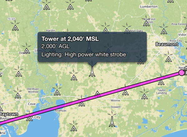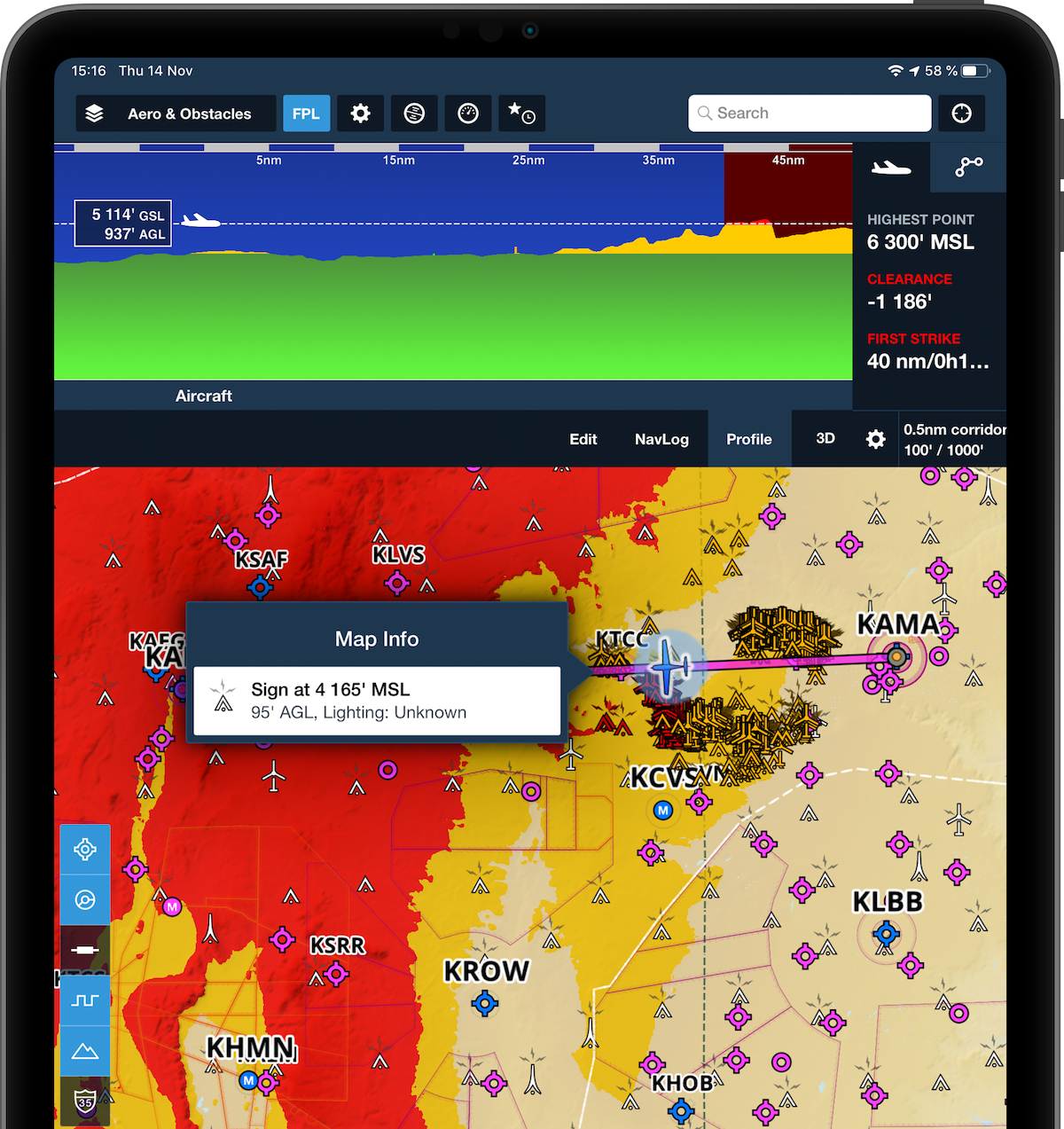 Turning on the obstacles layer on the map view allows you to tap on any obstacle on a chart to get detailed information on lighting, type, and MSL and AGL height.