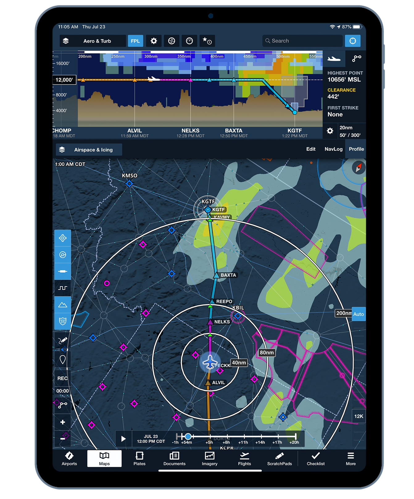Profile view scrolls along as you fly and continuously updates your height AGL. Pack for your trip to view weather and airspace in Profile view while in the sky.