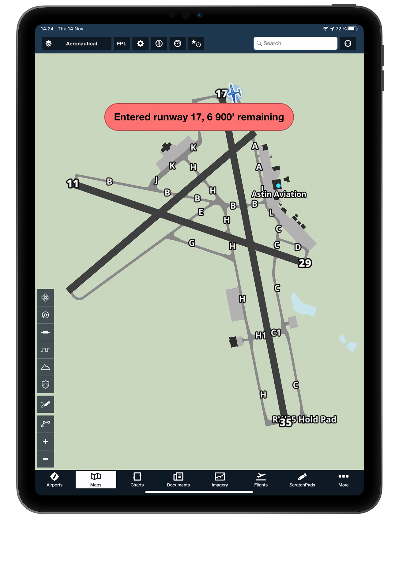 Zoom in to view airport diagrams, complete with runways, taxi labels, hotspots, and FBO locations. See your aircraft position without having to open the published airport chart.