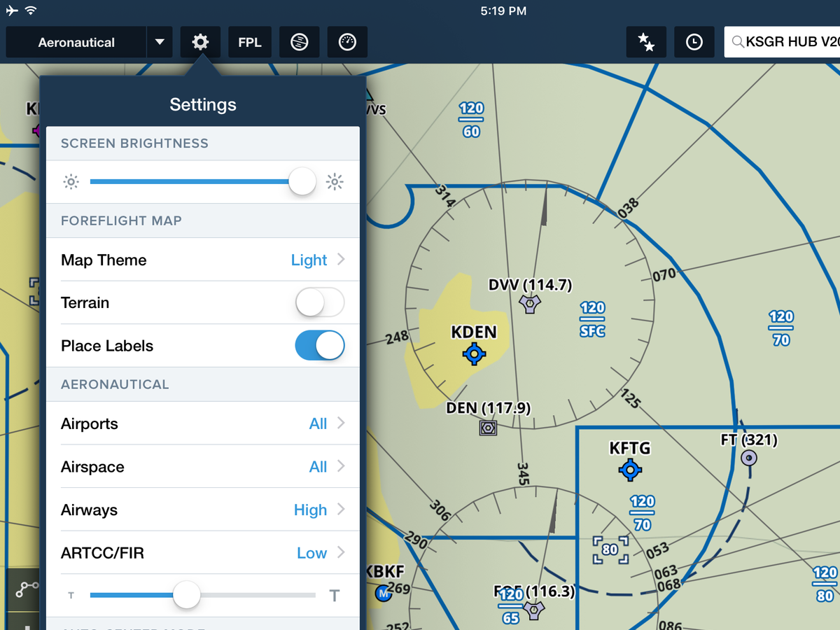 Customize the Aeronautical Maps layer using the Map Settings menu. Configure airports, airspace, airways, map themes, text label size, and more.