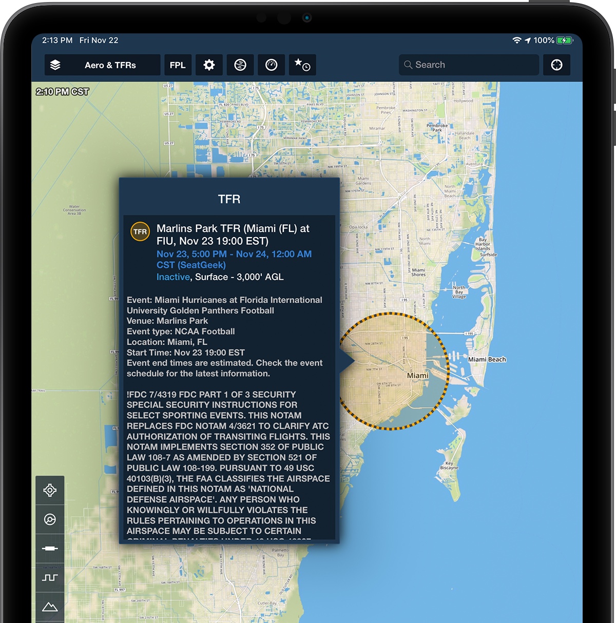 Figuring out when and where Stadium TFRs are active can be a pain. ForeFlight continuously monitors event schedules for Major League Baseball, the National Football League, NCAA Football, Indy Car, NASCAR Sprint Cup, and Formula 1 and integrates that information into the TFR map layer.
