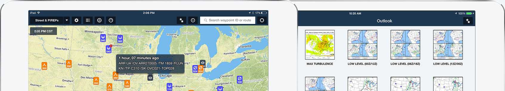 ForeFlight's industry-leading weather visualization capabilities are now better than ever. Five dynamic Map layers graphically depict global icing, turbulence, and surface analysis forecasts, giving you the tools you need for more informed flight planning. You can view these layers on both mobile and on the web. Check out this article for a deeper dive into these weather features.