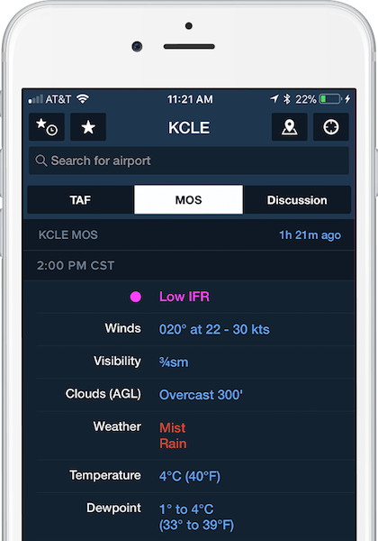 MOS is an automated weather product that generates forecasts for over 2000 U.S. airports, including many that do not receive official TAFs. Using advanced weather prediction models, MOS forecasts surface wind, visibility, clouds, weather conditions, temperature, and dewpoint, with forecast periods up to 3 days in advance.