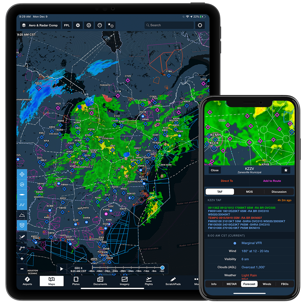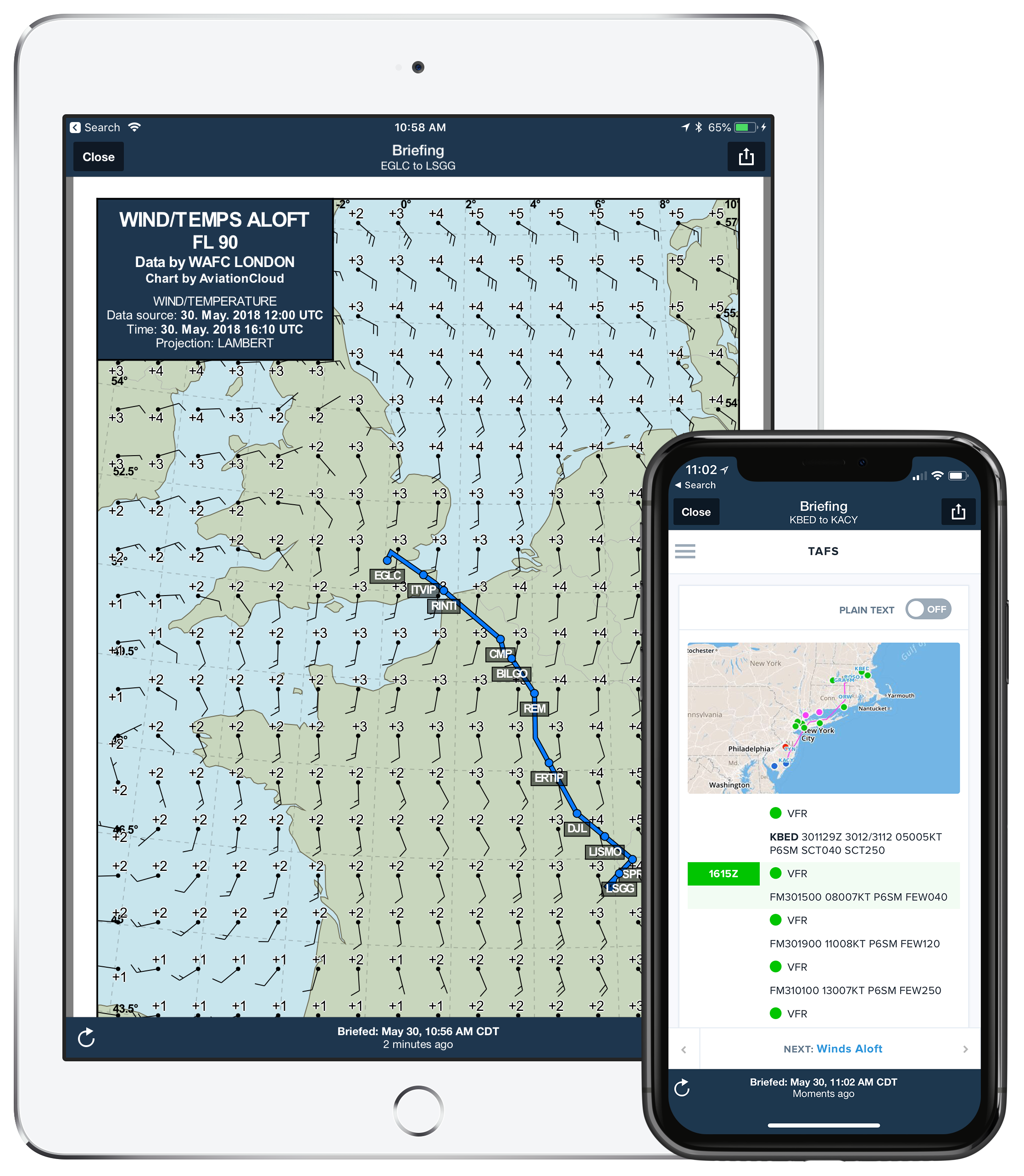 A comprehensive preflight briefing is a tap away when planning on the Flights view. With current and forecast conditions, NOTAMs, and advanced weather graphics, everything you need is delivered and synced between all the devices on your account and the web. After you file your flight plan, a copy of your briefing is sent to your email.