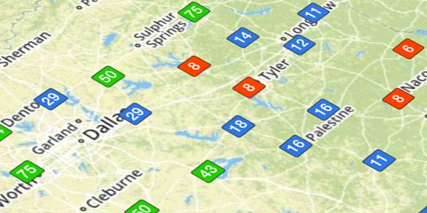 Color coded temperatures, plotted right on the map, based on current conditions.