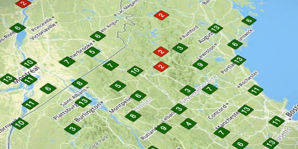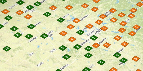 Color coded visibility values, plotted right on the map, derived from latest station reports.