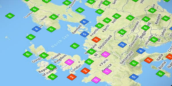 View global forecast wind speed, direction, and temperatures at multiple altitudes and times using these stunning animated weather layers. Both the “Winds (Temps)” and “Winds (Speeds)” layers use colorful heat maps covering the globe to represent their primary forecast values at the selected altitude and time. Overlaid on each layer’s heat map are smoothly-flowing particle animations representing wind direction and speed, providing an intuitive view of large-scale weather patterns in relation to the layer’s primary forecast value (wind speed or temperature). Use the Time Slider to view wind forecasts in a 24+ hour period, and move the Altitude Slider to view winds from the surface up to 63,000 ft.
