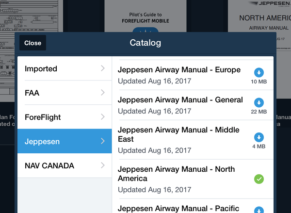 Jeppesen Airway Manuals are a valuable resource that accompany your Jeppesen chart coverage. Download the Manuals from the ForeFlight Documents catalog.