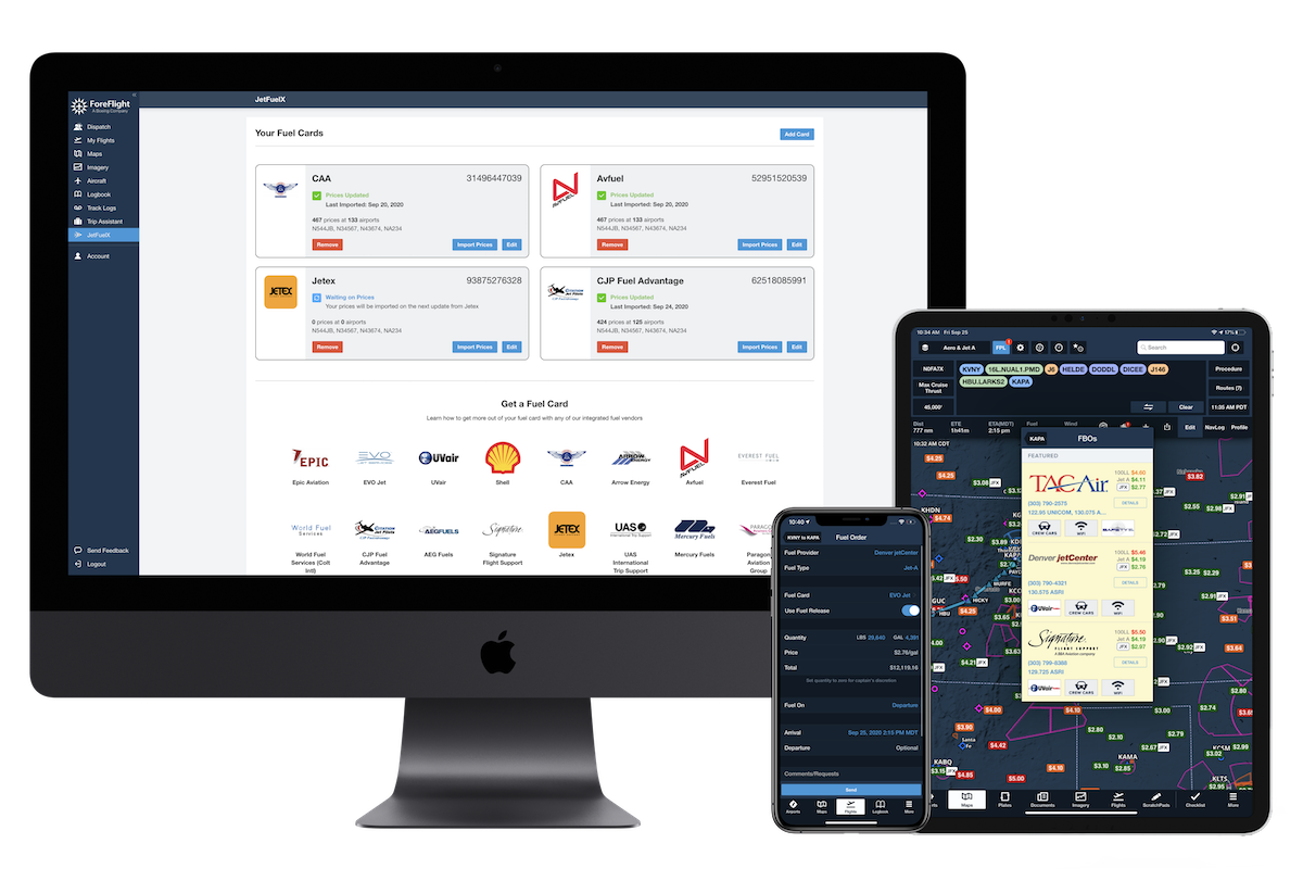 Easily manage your multiple Jet-A fuel card memberships in one place, compare prices while flight planning, and issue fuel releases right from ForeFlight with this powerful and integrated capability, available with Performance Plus and Business Performance subscription plans.