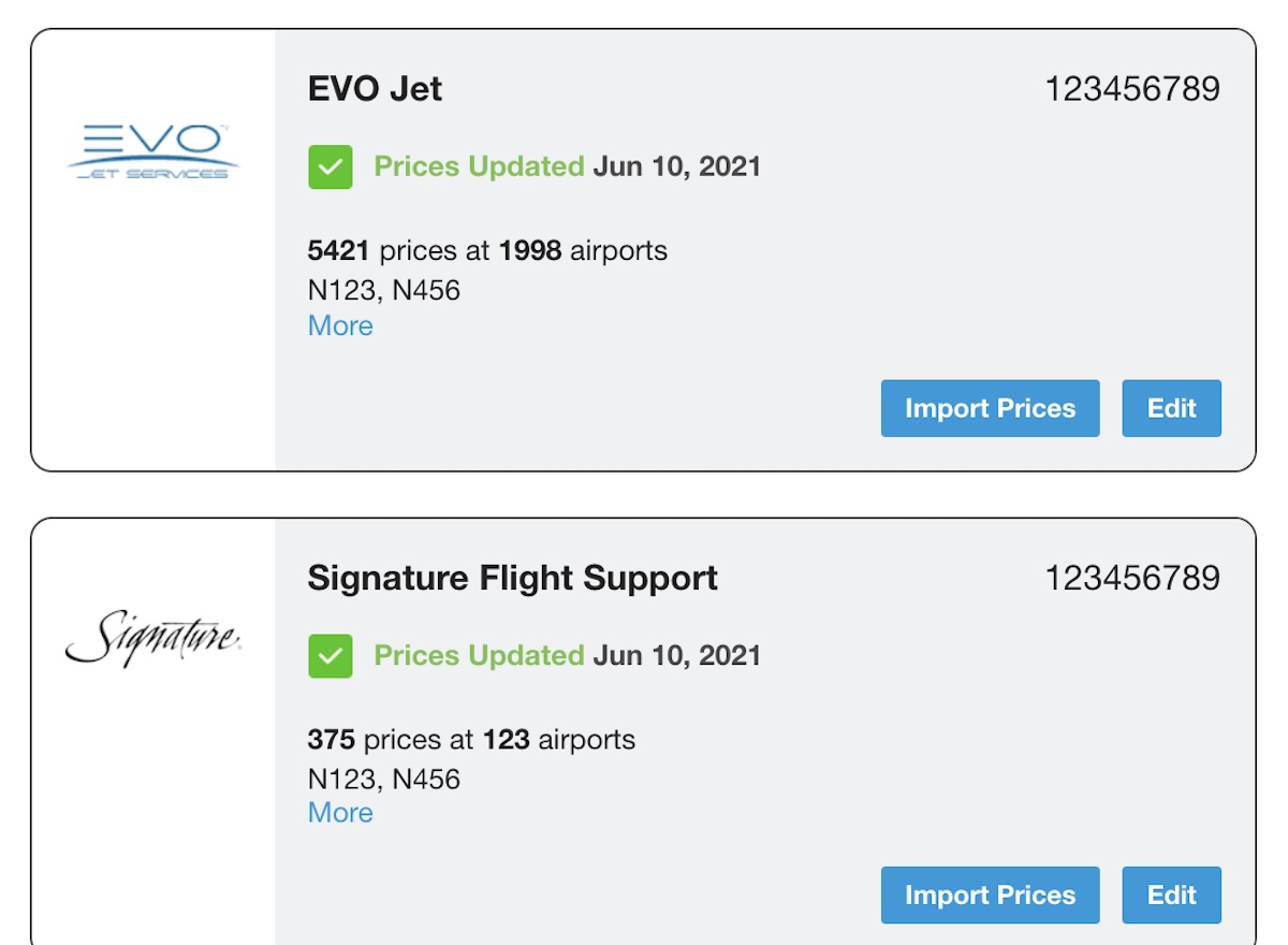 Great for flight departments with more than one airplane, or for aircraft on leaseback that have different fuel discount levels. Associate all your pricing with one aircraft, or individually.