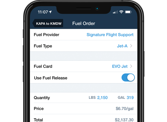 Submit requests for mobile fuel releases with supported contract fuel cards directly from the ForeFlight Mobile app so the vendor can contact the FBO and release the fuel before you arrive.