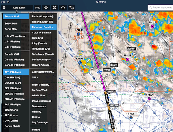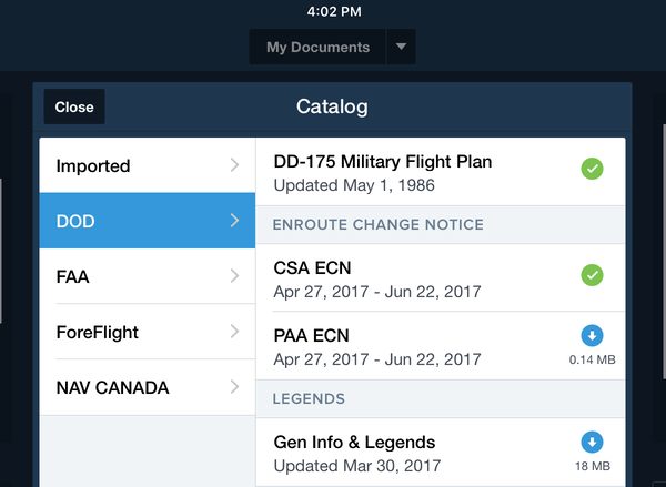 ForeFlight offers the only mobile solution to download and display the complete library of Joint Operations Graphics (JOG), Tactical Pilot Charts (TPC), Operational Navigation Charts (ONC), and Range charts. The charts use the newest format standard in military digital chart technology, developed by the National Geospatial-Intelligence Agency, called Enhanced Compression Raster Graphics (ECRG), and when combined with ForeFlight's compression process technology, the results are faster over-the-air (wireless) downloads, less storage space, higher resolution, and quicker load times. An innovative new Graphical Chart Manager makes it easy to select and download large areas of chart coverage.