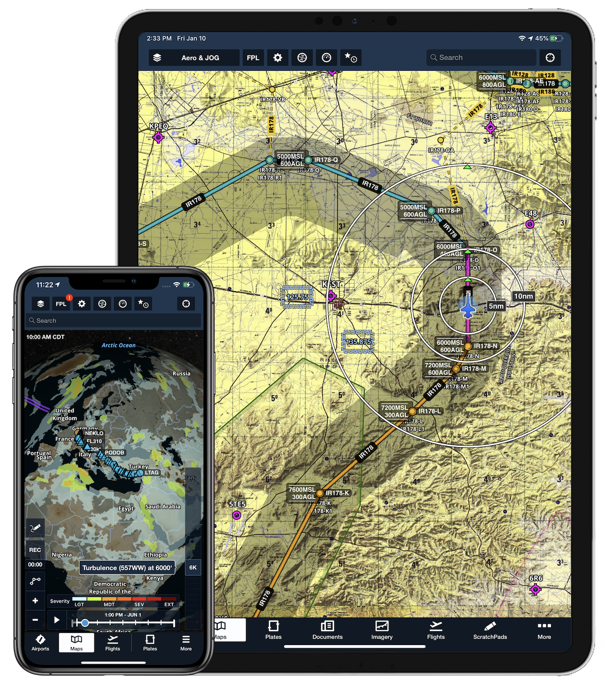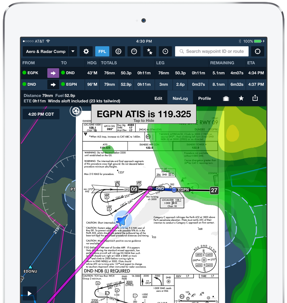 Plates on Maps allows you to view geo-referenced approach plates and airport diagrams overlaid onto the maps view, along with hazards and weather in one seamless view.