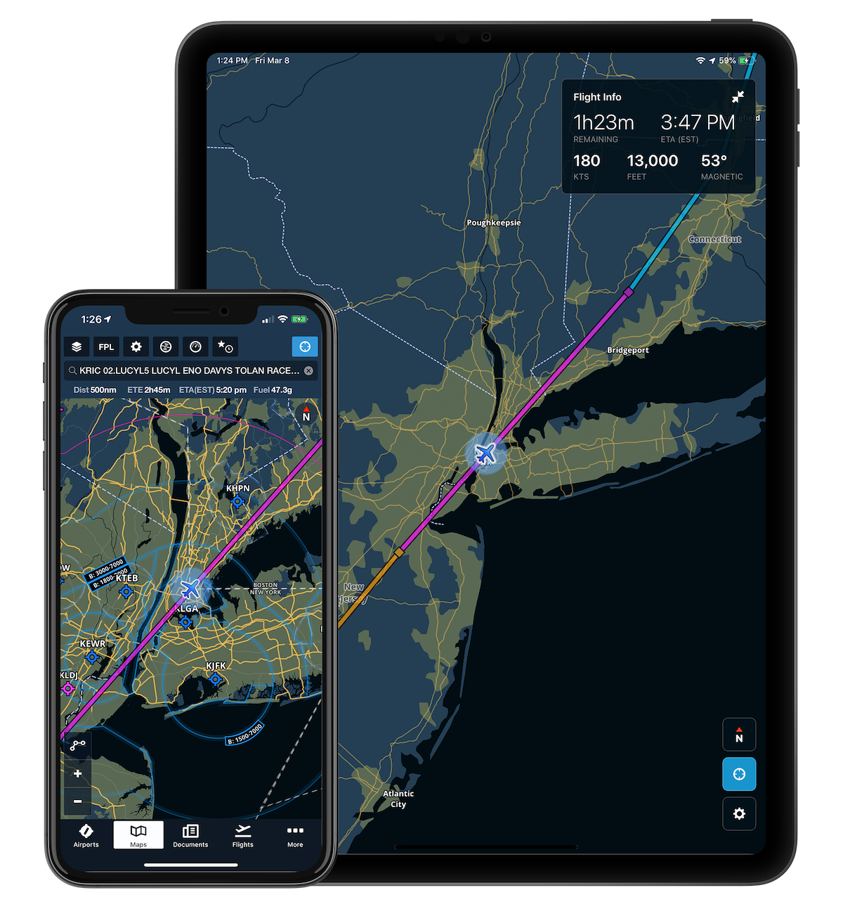 Once your pilot enables route sharing in ForeFlight, Passenger will automatically connect and display the current route on your device, along with any changes made during the flight. There’s no limit to how many devices ForeFlight can share its route with, so everyone on board can stay on the same page with Passenger.