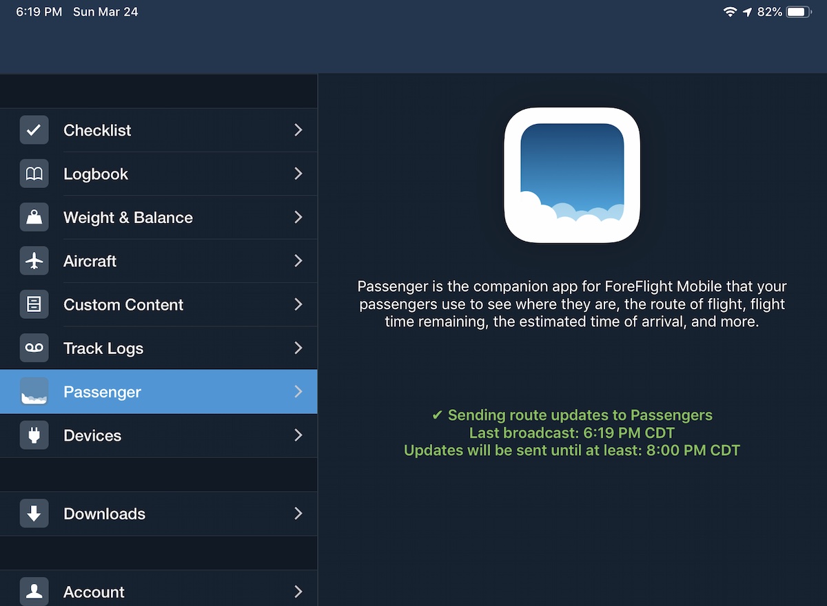 If you're using a Wi-Fi only iPad or don't have a GPS fix, ForeFlight will also share GPS data with your device so you can see your current position in Passenger.