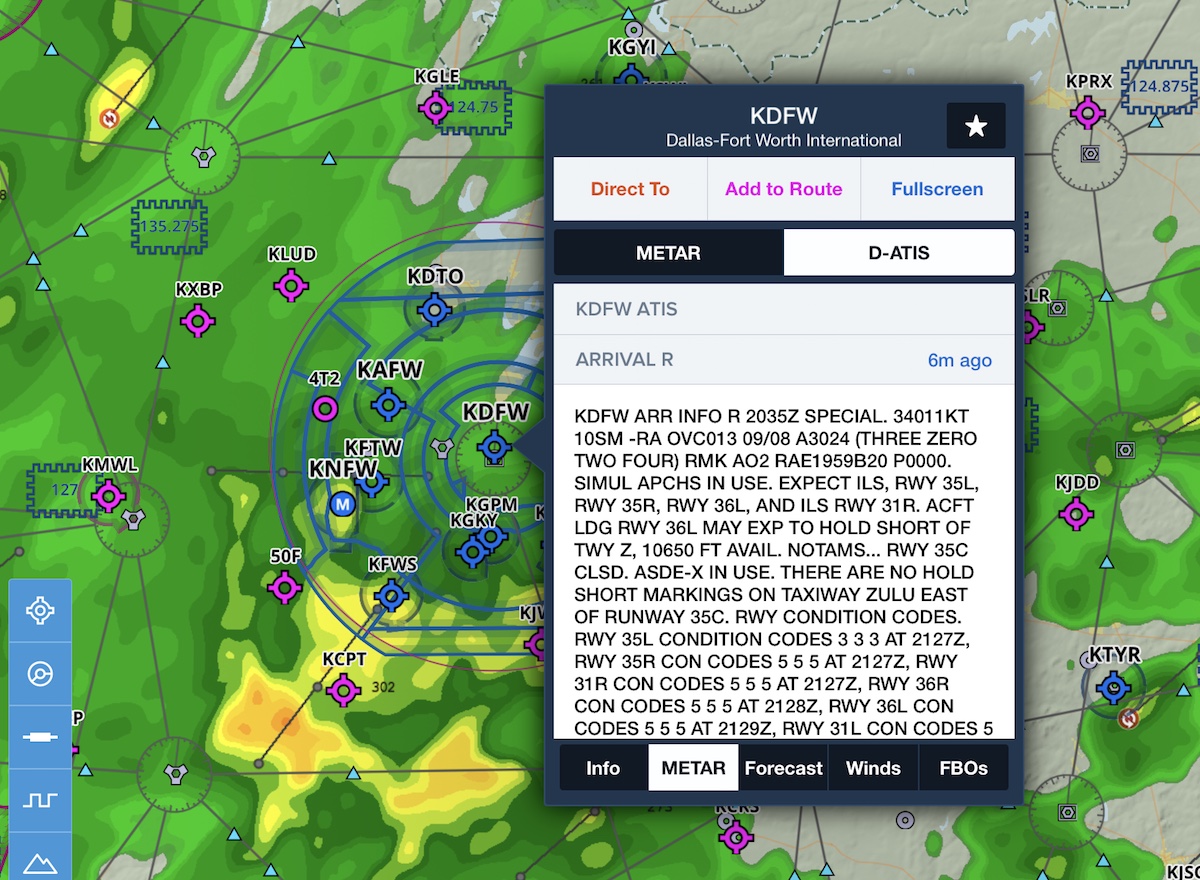 In addition to sending the current ATIS via text and email before a flight, ForeFlight also displays the D-ATIS directly in the app. Look in the Airports view under Weather or in the METAR tab of the airport popup on Maps to find the current ATIS, including both arrival and departure ATIS's for airports that provide both.