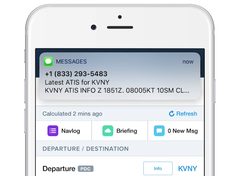 Whether or not you register for PDC, ForeFlight helps you get in the air sooner with automated D-ATIS delivery at over 70 major U.S. airports. Just file an IFR or VFR flight plan through ForeFlight and the current ATIS will arrive via text message about 15 minutes before your departure time.