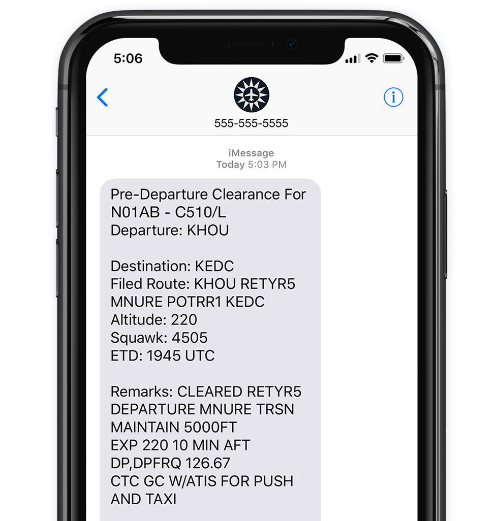 PDC, a service in partnership with Satcom Direct and Honeywell, automates delivery of your IFR departure clearance at over 70 U.S. airports, simplifying operations and reducing frequency congestion. After you register your aircraft, file with ForeFlight and automatically receive your full clearance via email and text message. Current ATIS information is also sent via text and email as well as being available directly in ForeFlight.