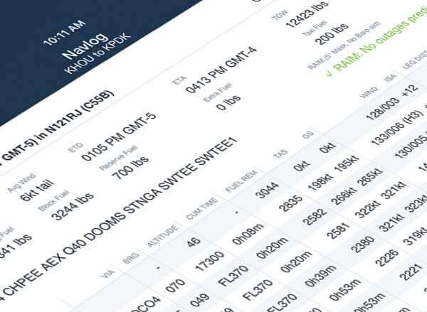 The neatly organized and printable Navlog includes flight and fuel summary information, TOC, TOD, synthetic waypoints along track, a wind and temperature aloft table for quick reference, RAIM prediction report, FMS flight plan recall codes (for compatible equipment), airport and FBO information, space to record flight actuals, and more.