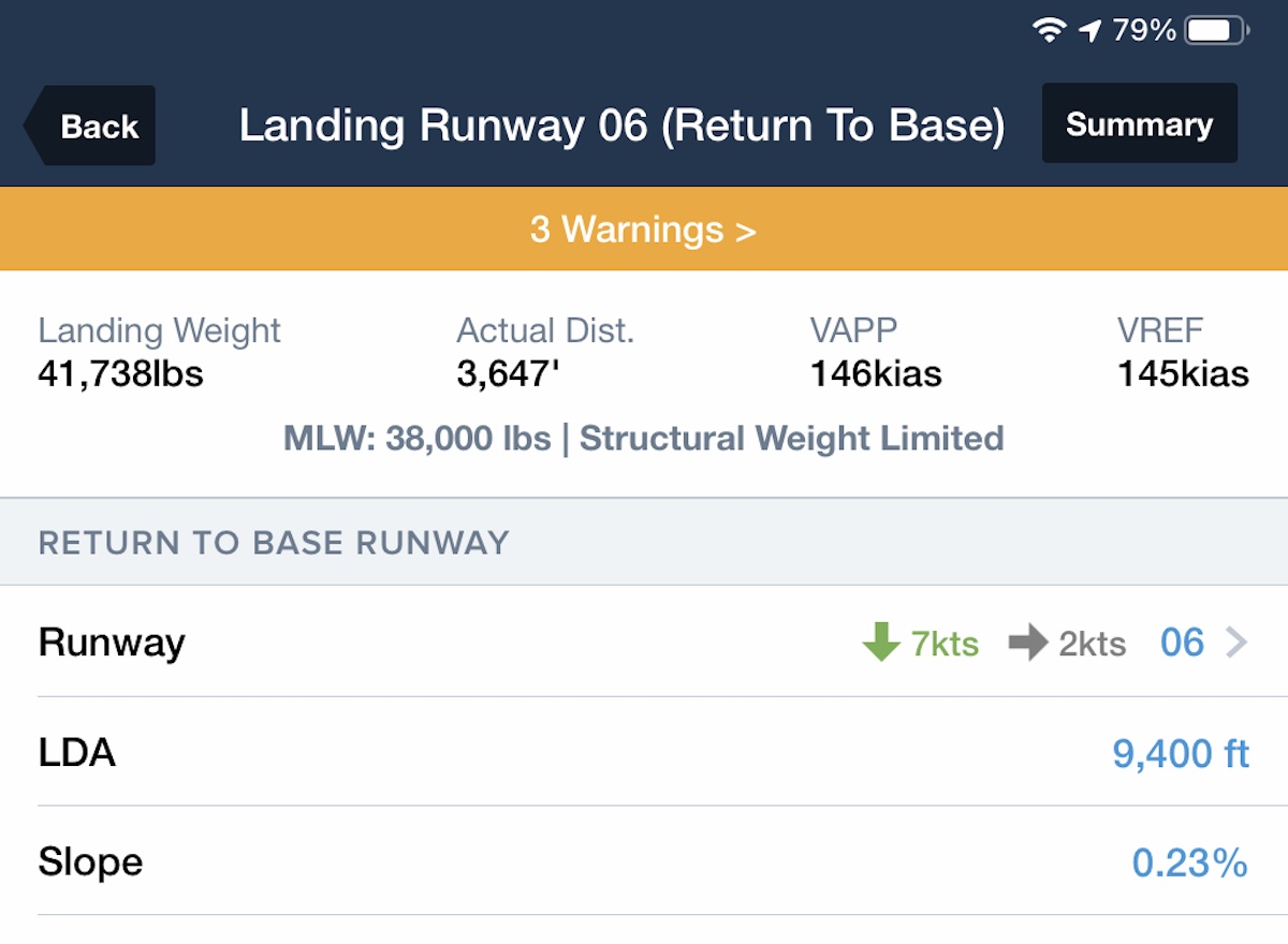 A fully-featured Landing Analysis capability built into the Takeoff Analysis allows you to evaluate Return-To-Base scenarios using different runways and aircraft configurations to determine the best course of action in case of an emergency. ForeFlight provides warnings for exceeding brake energy or weight limits to help you determine the risks of each scenario.