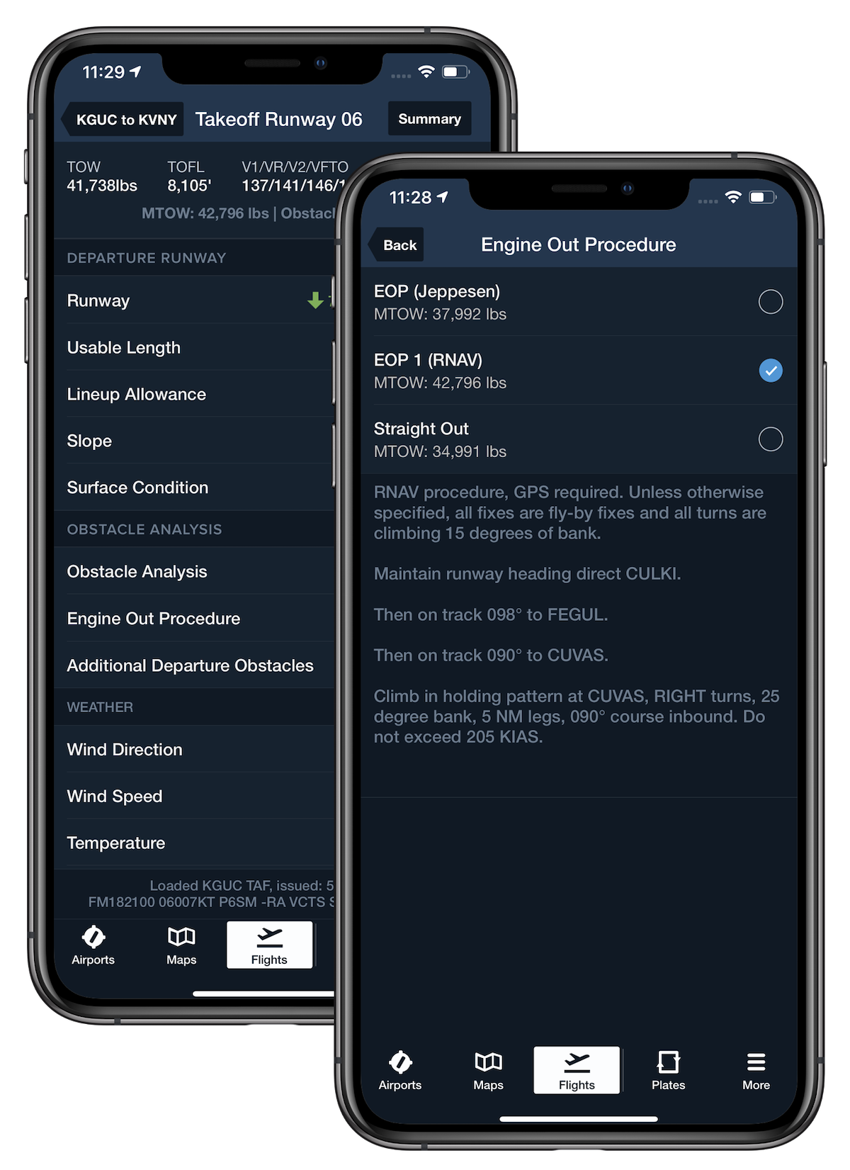 Plan with the default Straight Out procedure or optimize your weight margins with RNAV procedures developed by ForeFlight's team as well as Jeppesen's VOR-based procedures.