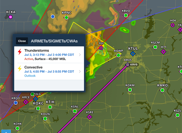 Graphical weather overlays on the map are essential to learning about aviation weather. Overlay a planned route with winds aloft, convective activity, TFRs, and more, and students will quickly build the skills to make go/no-go decisions.