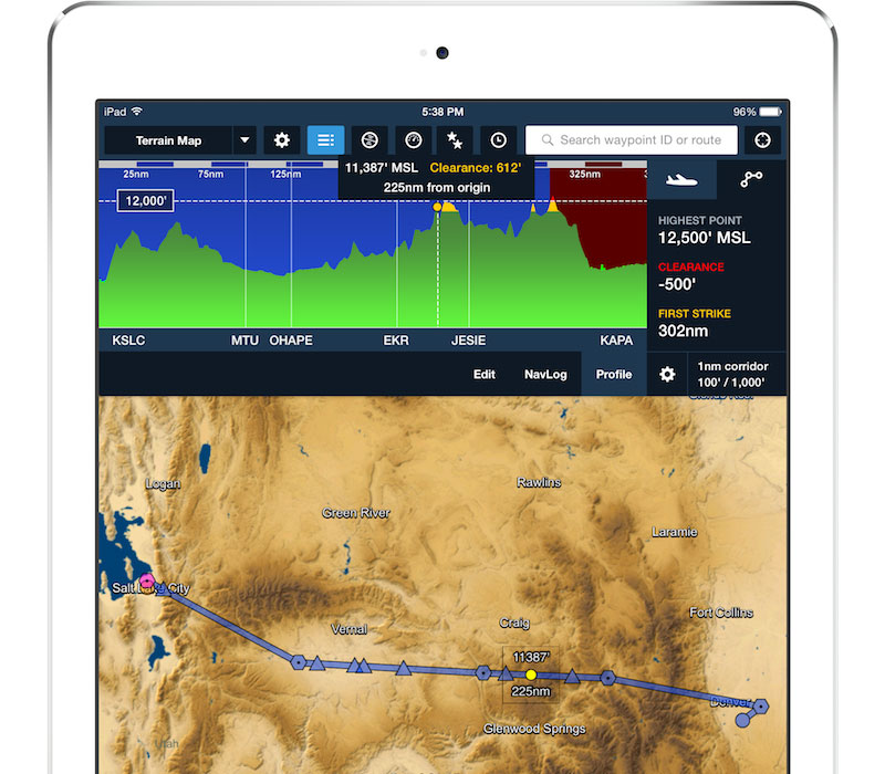 For Air Ambulance operations, ForeFlight's hazard awareness features make it easy to comply with the Part 135 obstacle height regulation. The Profile view helps you to quickly identify and document the highest obstacle along a planned route of flight.