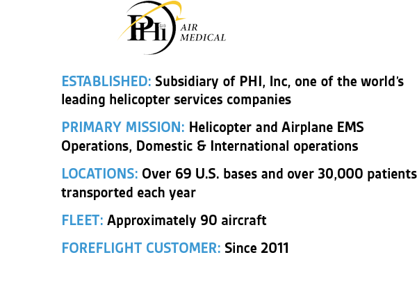 PHI Air Medical is the leading air ambulance provider in the U.S., operating out of more than 69 bases and transporting more than 30,000 people each year. With a steadfast commitment to providing safe and effective service to both the patients they transport and the communities they serve, PHI Air Medical is unwavering in its commitment to seek out and adopt the most efficient technology to both meet and exceed their flight planning and flying needs.